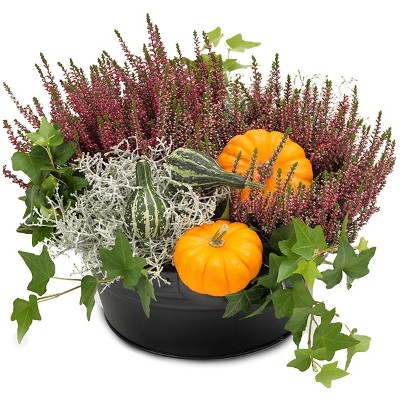 Høstens vakreste beplantning med planter som rosa lyng, sølvtråd, eføy og søte gresskar. Beplantningen er et eksklusivt blomsterhåndverk, og plantene er nøye utvalgt for å sikre høy kvalitet. Hver oppsats er unik og skapes ut fra sortiment og sesong – men beholder alltid sin farge og form. Arrangementet leveres av en lokal dekoratør.